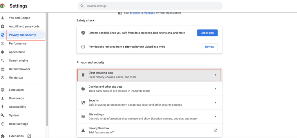 2) I det nye vindue, der åbnes, skal du vælgePrivatliv og sikkerhedfra venstre sidebjælke, og klikRyd browserdata.