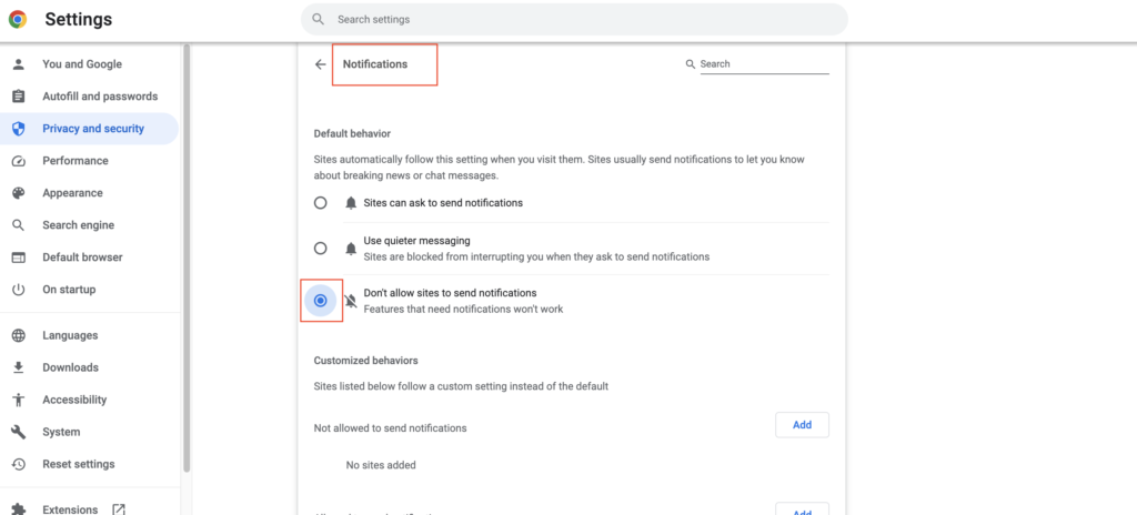 4) Alternativt i denneMeddelelsersektion, hvis du vil deaktivere alle meddelelser, kan du blot vælgeTillad ikke websteder at sende meddelelser.