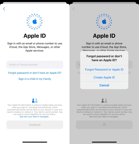 Trin 1.Tryk på på enhedens opsætningsskærmGlemt adgangskode eller har du ikke et Apple ID?.