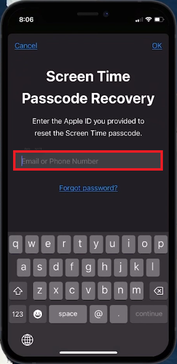 Når dit Apple-id er bekræftet, bliver du bedt om at oprette en ny adgangskode til skærmtid.