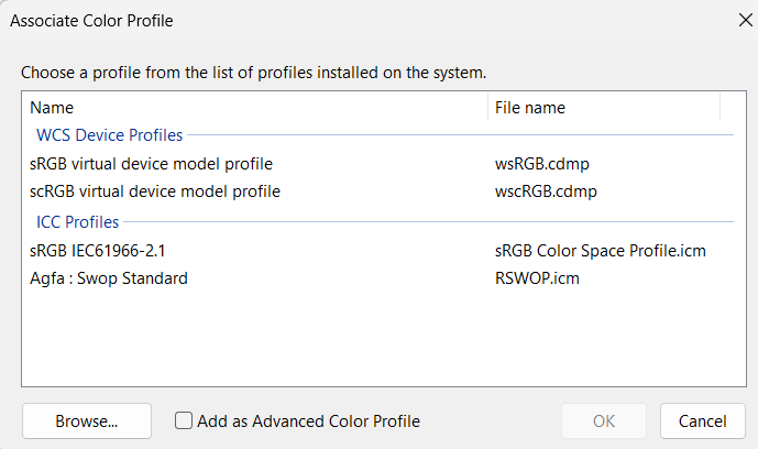 Trin 7– Brug sRGB Virtual Device Model Profile fra listen, og klik på OK.