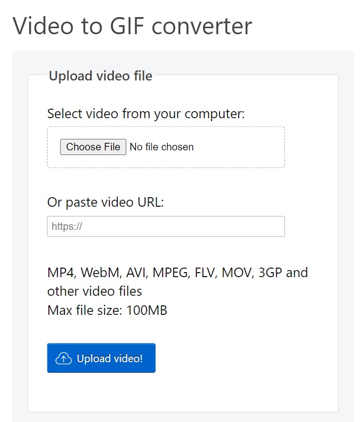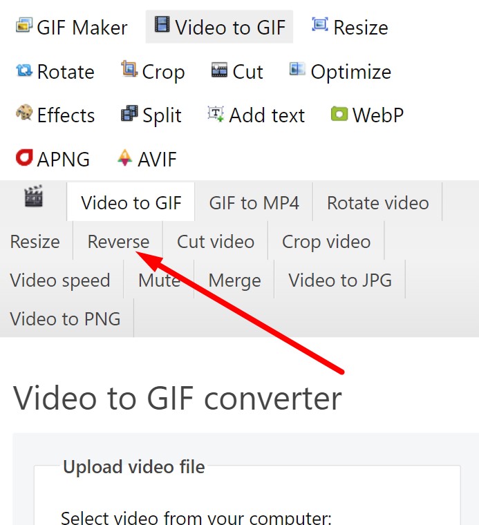 - Når du kommer til EZ GIF-webstedet, skal du i menuen vælge Video til Gif.