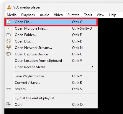 Åbn VLC Media Player-applikationen og den video, du vil rotere. Hvis du ikke kan åbne videoen ved hjælp af VLC, så naviger tilMedierog vælgÅbn fil. Du kan vælge den video, du ønsker at rotere fra dinFil Explorer.