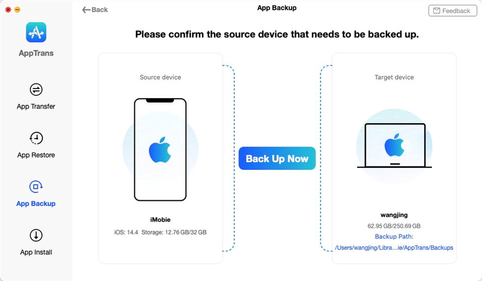 Trin 1.Installer AppTrans gratis og åbn den på din Mac eller pc og brug USB-kablet til at forbinde din mobile enhed til computeren. Klik påApp backupikon, der er placeret i venstre side af AppTrans' velkomstvindue.