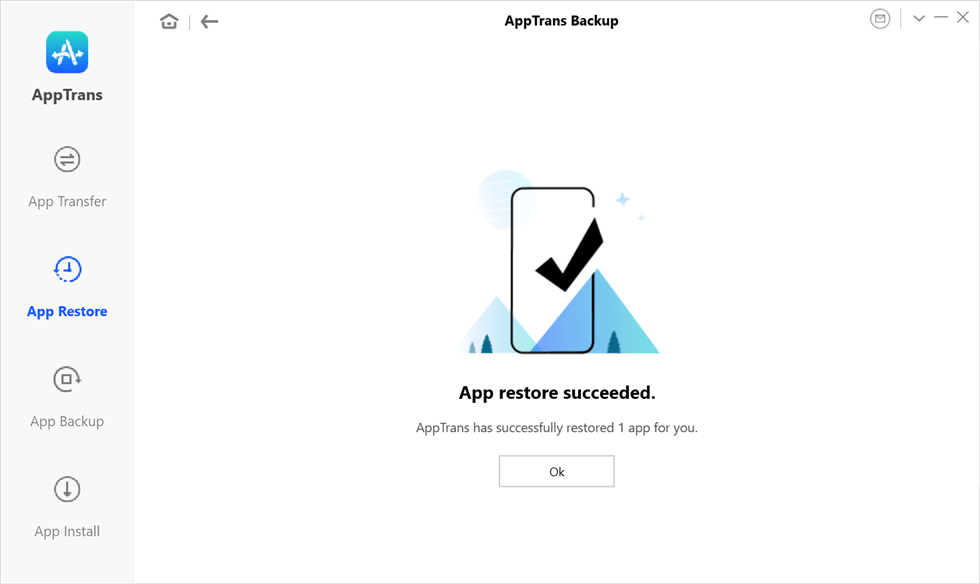 Trin 5.Når sikkerhedskopieringsprocessen er fuldført, skal du gå tilbage til velkomstsiden og vælgeAppgendannelsemulighed i venstre panel. Tryk derefter på knappen Gendan for at gendanne fra AppTrans Backup.