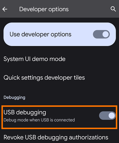 8. ÅbnUdvikler mulighederog aktivereUSB-fejlretningvalgmulighed.