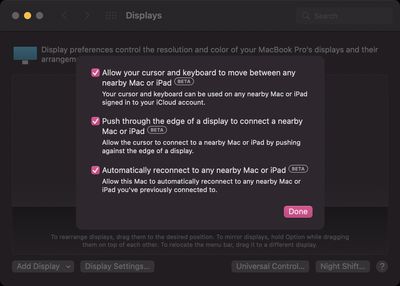 - Klik på afkrydsningsfelterne for at aktivere følgende Universal Control-funktioner (den første er aktiveret som standard):Tillad markøren og tastaturet at flytte mellem en Mac eller iPad i nærheden,Skub gennem kanten af en skærm for at tilslutte en Mac eller iPad i nærheden, ogGenopret automatisk forbindelse til enhver Mac eller iPad i nærheden.