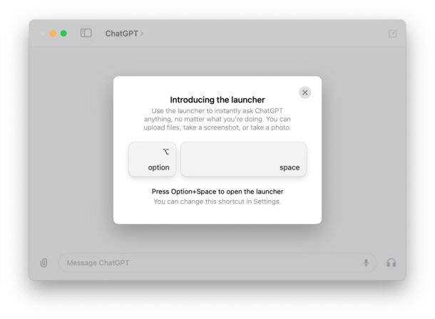 Når ChatGPT til Mac er åben, åbnes en ChatGPT-prompt fra et hvilket som helst sted på Mac'en ved at trykke på Option+mellemrumstasten: