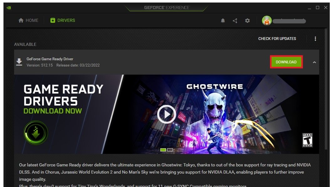 Sørg endelig for, at din grafikdriver er opdateret. Jeg foreslår at brugeGeForce Experienceapplikation til en NVIDIA GPU, men du kan også bruge AMD-driverpakken. Denne tweak kan gøre den største forskel afhængigt af, hvor ofte du opdaterer din GPU. I denChaufførerfanen, klik påDownload,og programmet vil automatisk downloade og installere den nyeste driver.