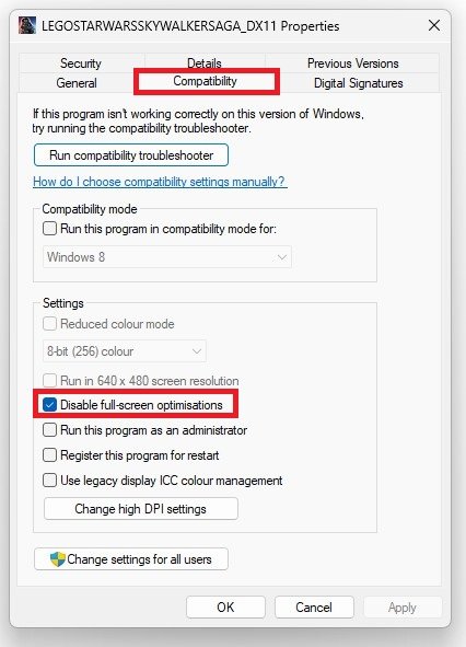 Sørg for, at du er iKompatibilitetfanen og vælgDeaktiver fuldskærmsoptimeringerog anvende dine ændringer.