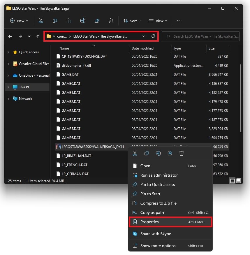 Åbn dinFil Explorerog naviger til det drev, hvor du gemte spilletProgram filer>Damp>steamapps>fælles>LEGO Star Wars: The Skywalker Sagaher højreklik på StarWars.exe-applikationen og gå til densEgenskaber.