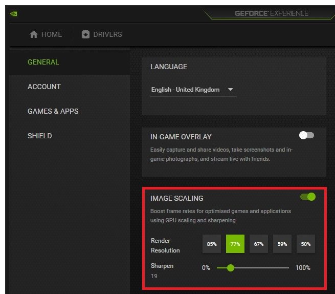 GeForce Experience > Generelle indstillinger > Billedskalering
