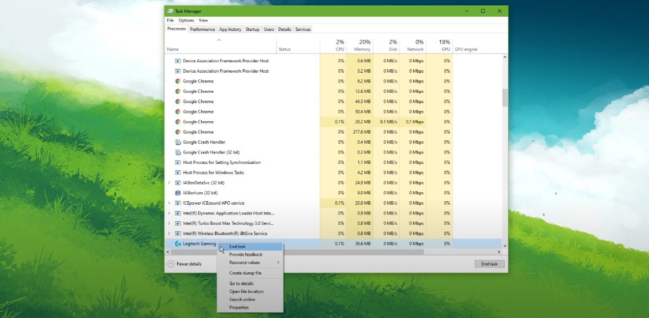 Sørg for, at Logitech Gaming Software (LGS) ikke kører på dit system. Luk programmet, og bekræft, at ikonet ikke er synligt i proceslinjen. Højreklik på din proceslinje for at åbne dinTask manager. På fanen Processer skal du afslutte alle Logitech Gaming-opgaver, der stadig kan køre i baggrunden.