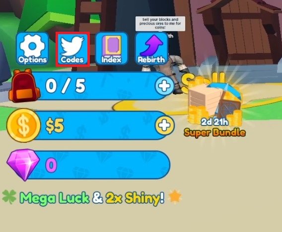 Først skal du åbne Roblox på din mobile enhed eller pc og slutte dig til en Mining Simulator 2-server. Efter indlæsning i spillet skal du klikke på Twitter-ikonet i venstre side af din skærm for at få adgang til kodeindløsningsdialogboksen.