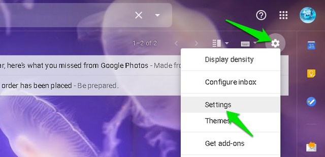 Hvis du ikke modtager e-mails fra en bestemt e-mailadresse, så er der en mulighed for, at du måske har blokeret den ved et uheld. For at tjekke din blokeringsliste skal du klikke på"Gear"ikonet i øverste højre hjørne, og vælg"Indstillinger"fra det.