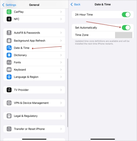 At have en manuel tidszoneindstilling kan desynkronisere trinsporing. Aktivering af automatisk tidszone sikrer ensartet tidssporing mellem din telefons system og Pokemon GO-servere, hvilket reducerer synkroniseringskonflikter og forbedrer Adventure Sync-ydeevnen. Bare gør det sådan her.