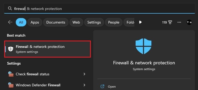 Først skal du sikre dig, at Roblox-appen ikke kører på din pc, og søg efterFirewallat åbne op for dinFirewall og netværksbeskyttelsevinduet med systemindstillinger.