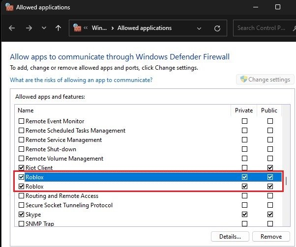 Vælg herTillad en app gennem firewallen. Klik på i dette vindueSkift indstillinger, slå Roblox op og sørg for, at begge disse afkrydsningsfelter er markeret, før du lukker dette vindue.