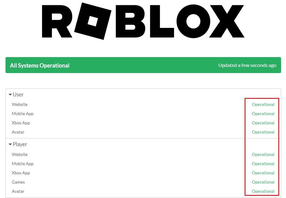 Dernæst skal du sikre dig, at Roblox-serverne er operationelle, da dette problem normalt er forårsaget af et netværks- eller serverproblem. Naviger tilstatus.roblox.comfor at komme til denne side. Udvid herBrugerogSpillerog sikre, at serverne er operationelle. Hvis dette ikke er tilfældet, skal du vente, indtil servervedligeholdelsen er udført.
