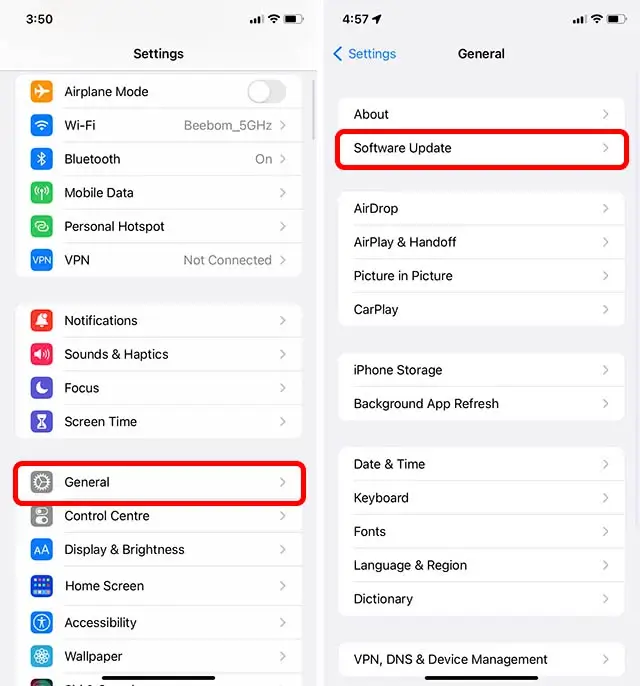 Hvis genstart ikke afhjælper AirPlay-problemet, skal du sikre dig, at din iPhone er opdateret til den nyeste firmware. Flere funktioner, der har tendens til at fungere fejl, bliver løst med firmwareopdateringen. Så opdatering af din iPhone kan øge AirPlay-ydeevnen. Brug disse trin for at opdatere en iPhone.Oplever du ingen lyd på AirPlay/Skærmspejling? Du skal kontrollere din lydstyrke, og om enheden ikke er slået fra.IndstillingerOpdater iPhone-firmware