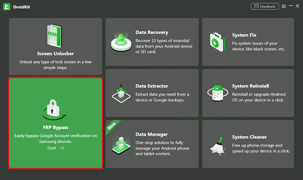 Trin 1. Download DroidKit og installer det på din computer. Når du har kørt softwaren, skal du vælge "FRP Bypass" fra hovedskærmen.