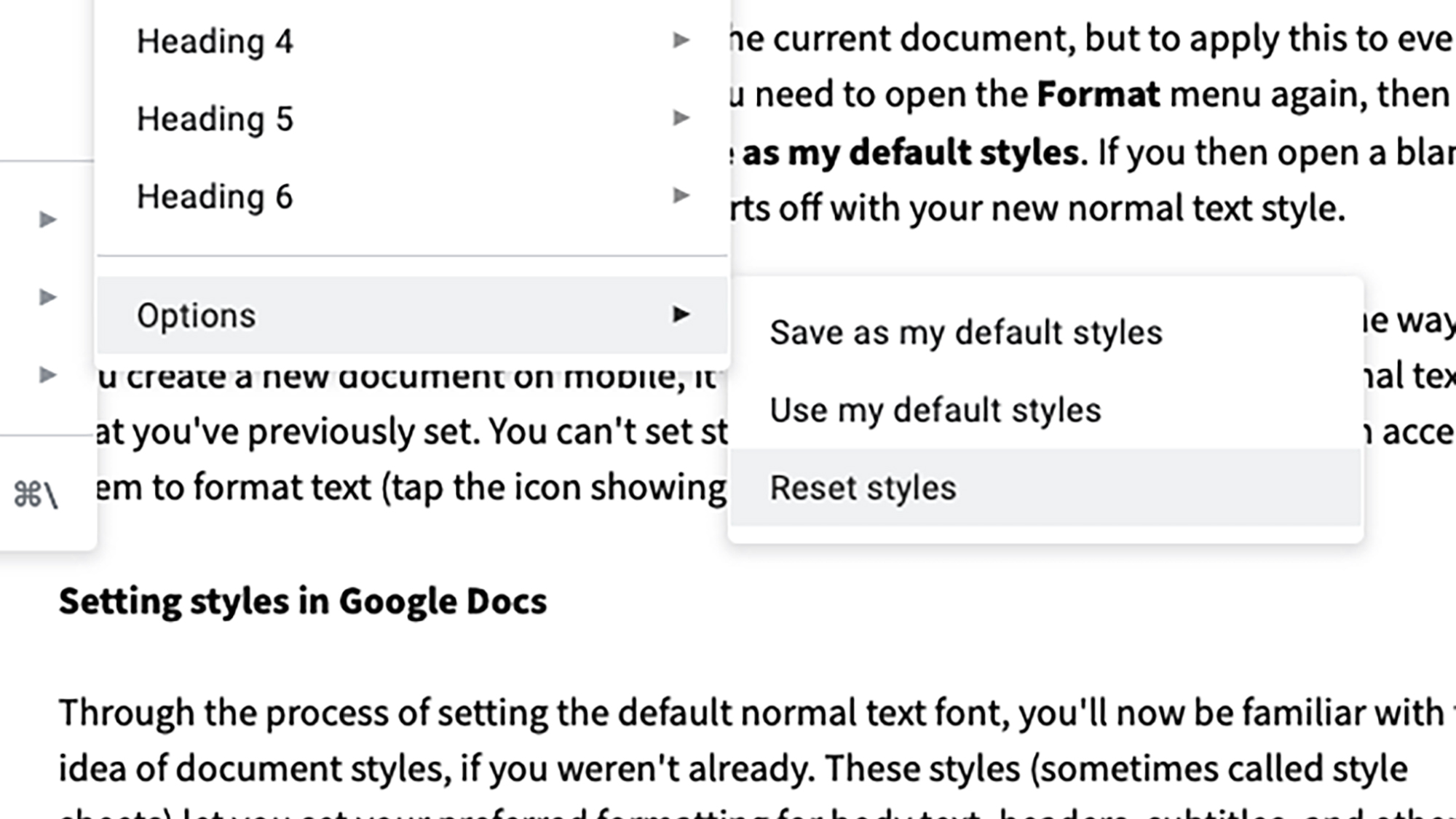 Du kan altid nulstille tilbage til standardstilene. Skærmbillede: GoogleGennem processen med at indstille den normale normale tekstskrifttype, vil du nu være bekendt med ideen om dokumentformater, hvis du ikke allerede var det. Disse typografier (nogle gange kaldet typografiark) lader dig indstille din foretrukne formatering for brødtekst, overskrifter, undertekster og anden tekst i dit dokument, så alt forbliver ensartet på tværs af siden.
