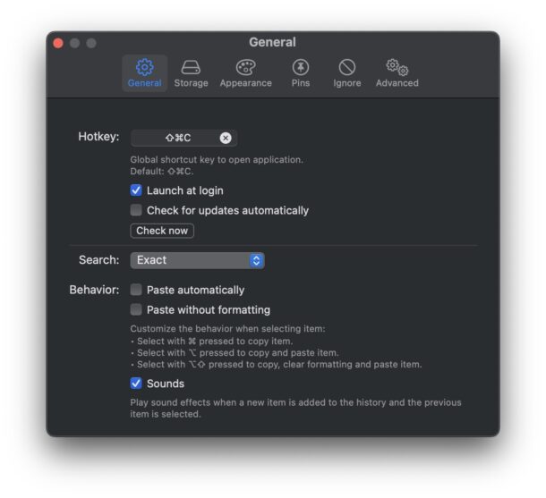 Maccy har også masser af tilpasselige præferencer, inklusive den praktiske mulighed for automatisk at starte ved genstart af Mac'en, samt kontrollere udklipsholderens historikbufferstørrelse, vælge bestemte apps til at ignorere, indstille genvejstaster, slå til/fra og meget mere: