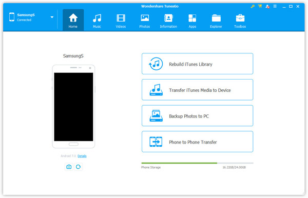 TunesGoaf Wondershare er en iOS- og Android-telefonarrangør. Du kan nyde mange interessante funktioner som at lave GIF osv., som giver dig mulighed for at undersøge alle data på din mobiltelefon, og effektiv app-administration, som giver dig mulighed for kun at eksportere og sikkerhedskopiere alle dine apps på én gang. Du kan bruge denne Wondershare TunesGo som et alternativ til android filoverførsel.