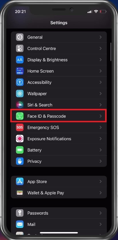 Åbn din indstillingsapplikation. Her skal du rulle ned og vælgeFace ID og adgangskode, eller i dit tilfældeTryk på ID og adgangskode.