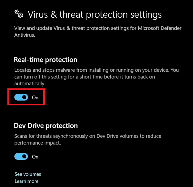 Du bør nu have fleksibiliteten til at aktivere eller deaktivere realtidsbeskyttelse, hvilket sikrer, at din pc's forsvarsmekanismer er operationelle og kan tilpasses dine sikkerhedspræferencer.
