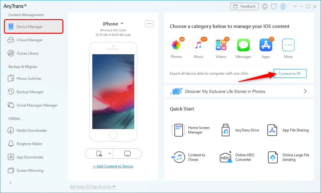 Trin 1. Download AnyTrans, installer og åbn den > Tilslut din iPhone til computeren via USB-kabel > Klik på Enhedshåndtering > Hvis du vil tilføje indhold til iPhone, kan du klikke på knappen "+" over telefonens skærm for at trække og slippe indhold. Hvis du vil overføre iPhone-data til Mac, skal du vælge Indhold til Mac. Her vælger vi Indhold til Mac.