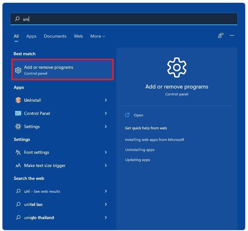 Nogle gange er tredjepartsapplikationer kendt for at forårsage flimrende skærmproblemer. Søg efterAfinstalleri din proceslinje søg for at åbne dinApps og funktionervinduet med systemindstillinger