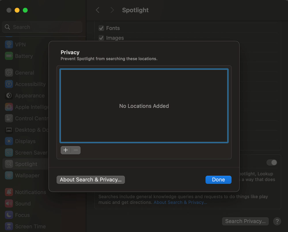 - Wechseln Sie zumPrivatsphäre durchsuchenRegisterkarte und klicken Sie auf+Klicken Sie unten in der Liste auf die Schaltfläche, um zu verhindern, dass Spotlight bestimmte Orte indiziert.