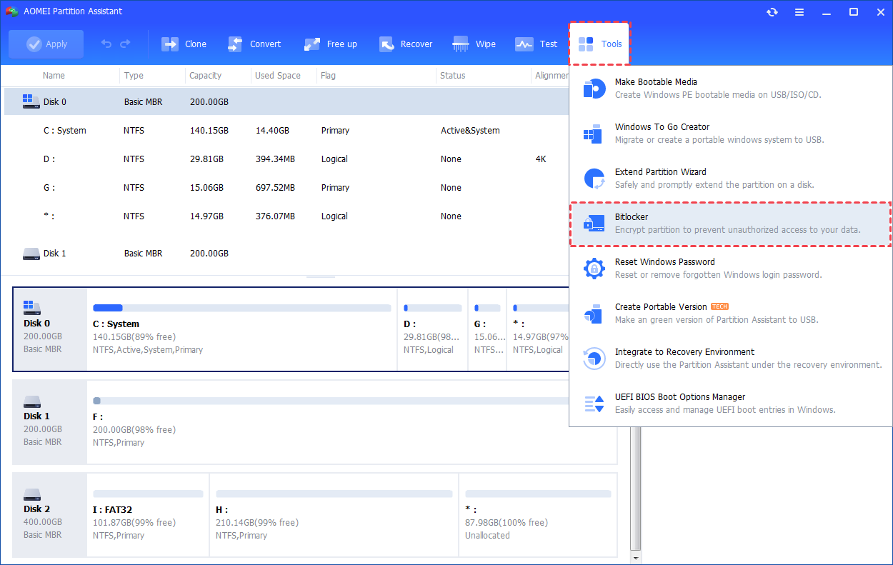 Schritt 2. Navigieren Sie zuWerkzeuge>BitLockerin der Hauptschnittstelle.