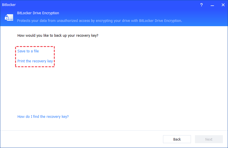 Tipp:Speichern Sie den Wiederherstellungsschlüssel nicht im Pfad des verschlüsselten Laufwerks. Andernfalls können Sie den Wiederherstellungsschlüssel nicht finden, wenn Sie nicht auf dieses verschlüsselte Laufwerk zugreifen können.