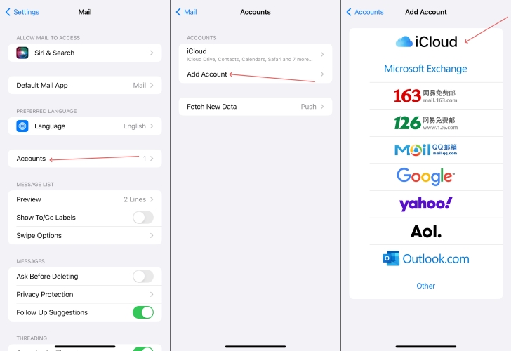 .Konto hinzufügen > iCloudSchritt 2.WählenMail > Kontenund tippen Sie dann auf