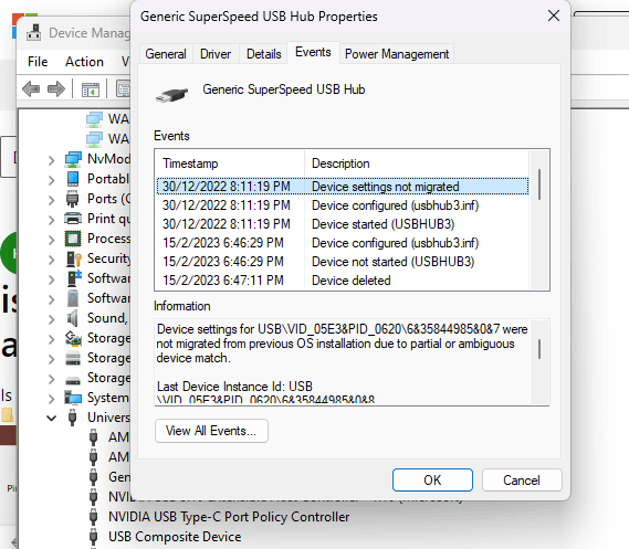 Im obigen Fall können wir feststellen, dass der Benutzer auf ein Problem mit nicht migrierten Geräteeinstellungen von Windows 11 stößt und sein USB-Hub keine angeschlossenen Geräte erkennt, obwohl er mit Strom versorgt wird. Eine genauere Betrachtung der Geräteereignisse offenbart jedoch einen Fehler im Zusammenhang mit dem Migrationsprozess während eines Windows 11-Updates.