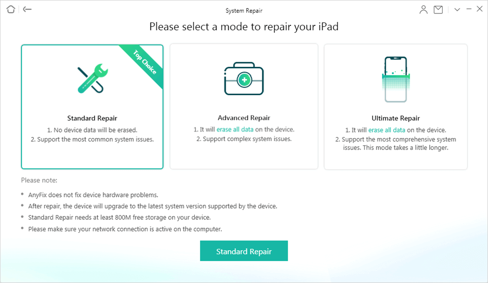 Schritt 3. Mit der Reparaturfunktion stehen jetzt drei Reparaturoptionen für iOS-Geräte zur Verfügung. WählenStandardreparaturDenn dadurch werden die häufigsten Systemprobleme unterstützt und es gehen nach der Reparatur keine Gerätedaten verloren.