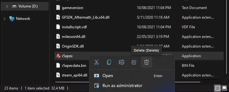 Es öffnet sich Ihr Datei-Explorer, in dem Sie die Datei löschen müssen, die das Spiel nicht lesen kann. Sie sollten außerdem die Anwendung r5apex.exe löschen.