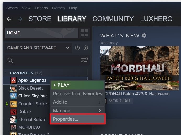 Wenn Sie dem Dateipfad in dieser Fehlermeldung folgen, sollten Sie zu diesem bestimmten Pfad gelangen.rpak-Datei. Wenn Sie es finden können, sollten Sie versuchen, es zu löschen. Öffnen Sie dazu Ihre Steam- oder Origin-Bibliothek. Ich werde diesen Schritt mithilfe des Steam-Launchers zeigen. Klicken Sie mit der rechten Maustaste auf Apex Legends und wählen SieEigenschaften.