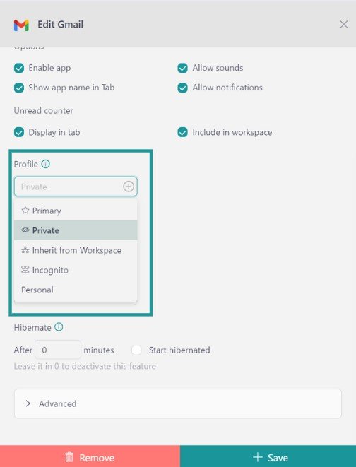 - Konfigurieren Sie die Anwendungseinstellungennach Ihrem Geschmack. Denken Sie daran, dass Sie auswählen können, welches Profil Sie in der App verwenden möchten (vom Arbeitsbereich übernehmen, primär, privat, inkognito oder ein benutzerdefiniertes Profil).