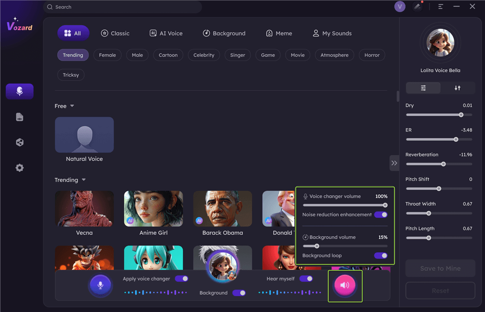 Vozard hebt die Stimmveränderung mit über 200 lebensechten Soundeffekten auf die nächste Stufe, perfekt für Spiele, Online-Chats und Live-Streaming. Dank der fortschrittlichen KI-Technologie können Sie sich in Echtzeit in Charaktere wie SpongeBob, Joe Biden oder Darth Vader verwandeln. Entdecken Sie Hintergrundsoundeffekte und beliebte Sound-Memes für endlose Unterhaltung.