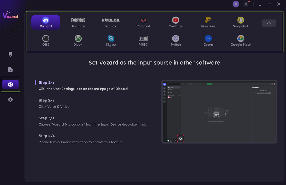 Schritt 1.Laden Sie Vozard kostenlos herunter und installieren Sie es auf Ihrem Computer. Öffnen Sie Vozard nach der Installation. Gehen Sie zu „Einstellungen” um Ihr „ einzurichtenMikrofon" Und "Lautsprecher.”
