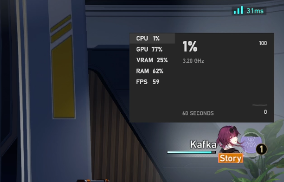 Sie haben die Flexibilität, dieses Fenster an einer beliebigen Stelle auf Ihrem Bildschirm anzuheften, um sicherzustellen, dass es auch dann sichtbar bleibt, wenn das Overlay inaktiv ist. Mit dieser Funktion können Sie wichtige Leistungsindikatoren wie CPU-, GPU-, VRAM- und RAM-Nutzung überwachen, während Sie in die Welt von Honkai Star Rail eintauchen.