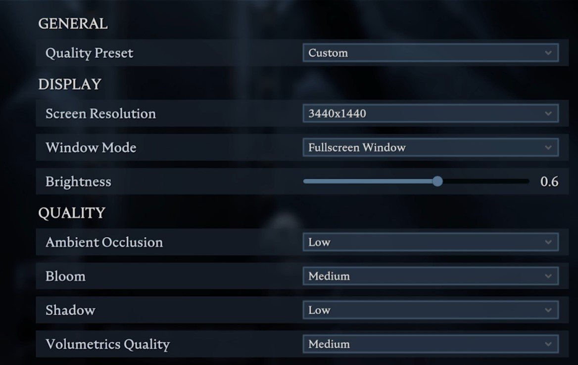 Stellen Sie die einBildschirmauflösungan die Auflösung Ihres nativen Monitors anpassen. Um die beste Leistung zu erzielen, sollten Sie unbedingt mitspielenVollbildmodus. DerHelligkeitDie unten stehende Option hat keinen Einfluss auf Ihre Leistung. Stellen Sie sie daher nach Ihren persönlichen Vorlieben ein. Stellen Sie die einUmgebungsokklusionOption in IhremQualitätEinstellungen zuNiedrig,BlühenZuMedium,SchattenZuNiedrig,UndVolumetrische QualitätZuMedium. Ich bevorzuge es, die Schatten auf ein Minimum einzustellen, aber vielleicht möchten Sie die Einstellung auf erhöhenMedium.