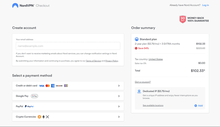 - Geben Sie Ihre E-Mail-Adresse ein und wählen Sie Ihre Zahlungsmethode aus.Schließen Sie die Zahlung ab. Sie erhalten 3 EXTRA-Monate für Ihren 2-Jahres-Plan!
