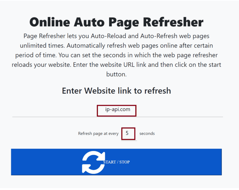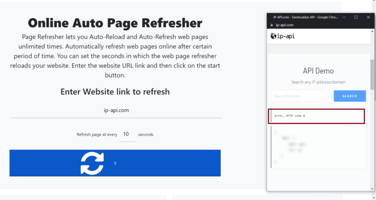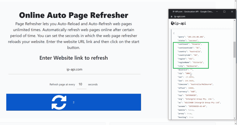 - Geben Sie „ip-api.com“ in das Seitenaktualisierungstool ein und legen Sie eine Aktualisierungshäufigkeit fest. Ich werde es für diesen Test auf 10 Sekunden einstellen.