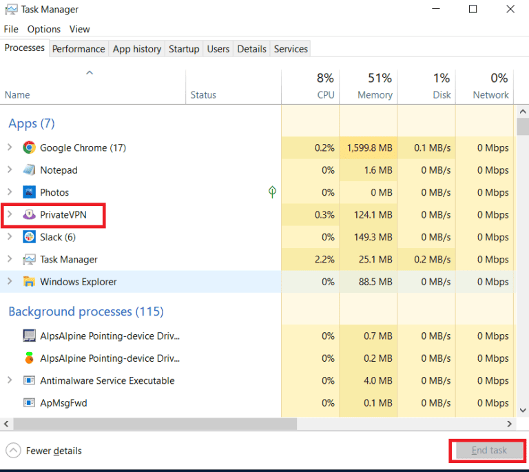 - Entfernen Sie PrivateVPN von der Ausführung im Hintergrund: Überprüfen Sie Ihren Task-Manager, um sicherzustellen, dass das VPN nicht im Hintergrund läuft. Wenn dies der Fall ist, stoppen Sie den VPN-Prozess.