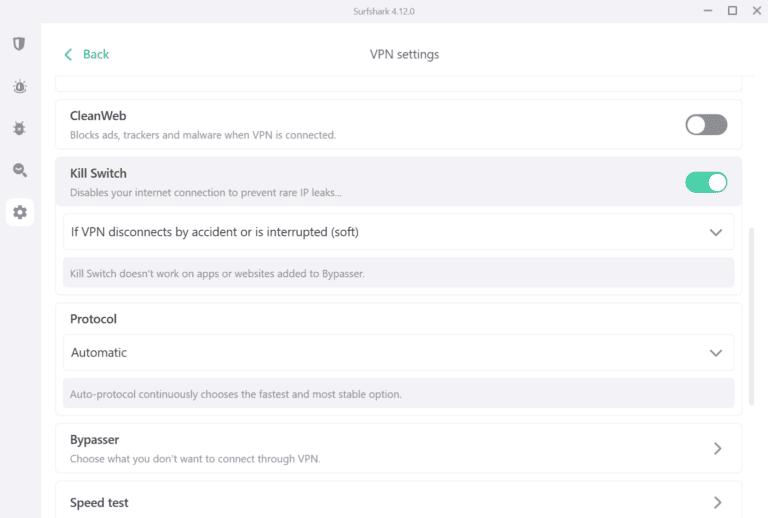 - Aktivieren Sie den Surfshark-Kill-Switch, um Ihre Internetverbindung vor DDoS-Angriffen zu schützen, wenn Ihre VPN-Verbindung unterbrochen wird. Gehe zuEinstellungen>VPN-Einstellungen>Kill-Schalterzu aktivieren.