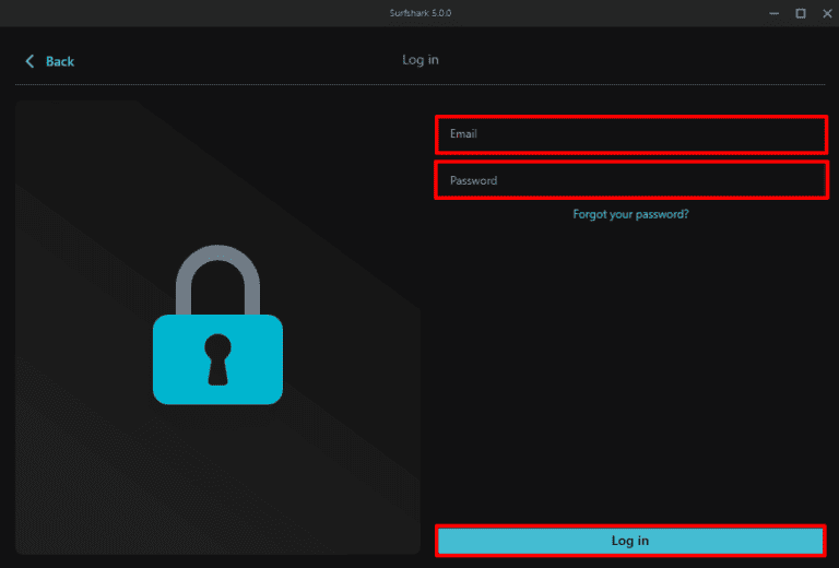 - Starten Sie die Surfshark-Windows-App und melden Sie sich mit Ihren Zugangsdaten (Benutzername, Passwort) an.